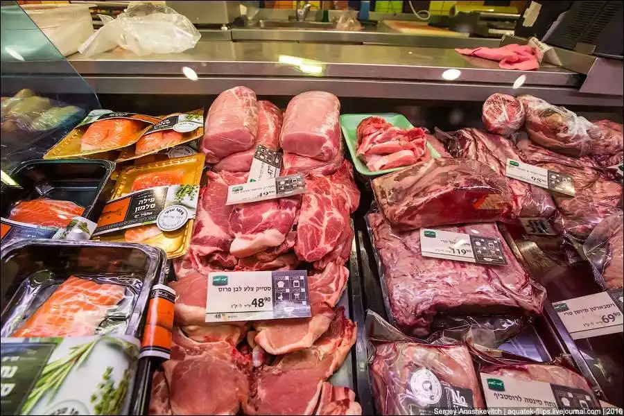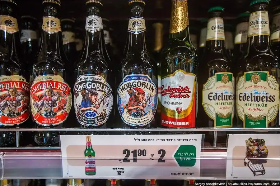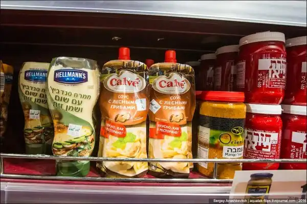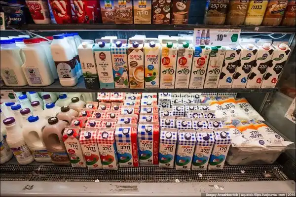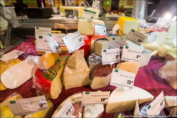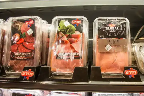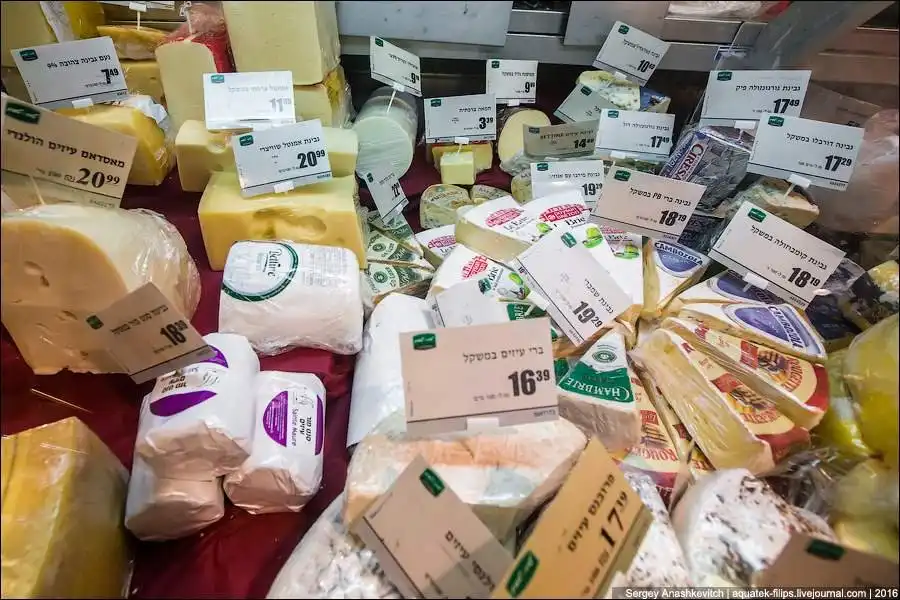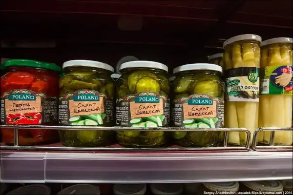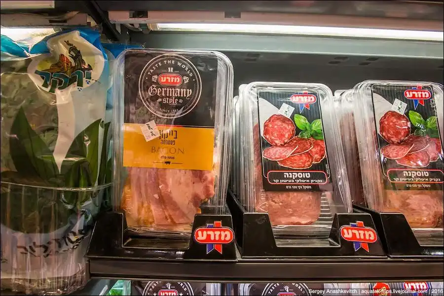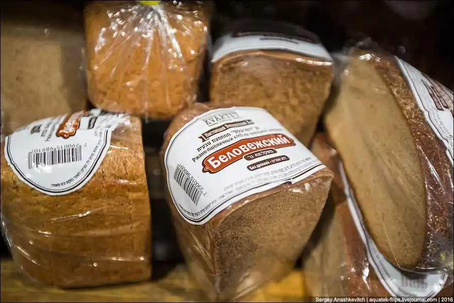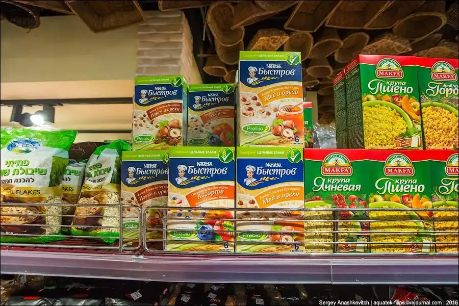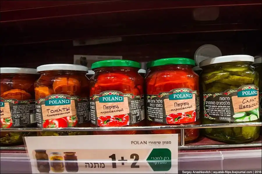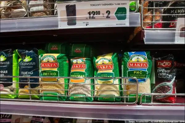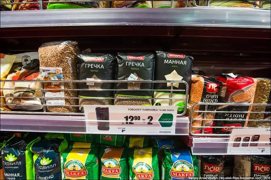Понятно, что с первыми массовыми волнами эмиграции в Израиле стали появляться и русские продуктовые магазины, в которых всегда можно найти любимые с детства продукты, как местные, так и привезенные из России, если здесь их не производят. Так что повсеместно без проблем можно купить и "жигулевское" пиво, и шпроты, и астраханскую воблу, и костромской сыр, и любимую гречку с перловкой, и "Аленку" с "Белочкой", и даже бекон и свиную грудинку для завтрака.
