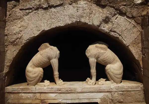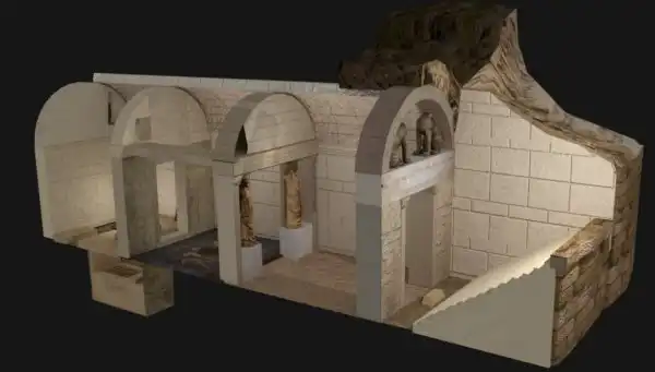 Раскопки 2014 года открыли миру три подземные комнаты. Спускающегося в них встречает пара крылатых сфинксов, некогда раскрашенных в яркие цвета. В следующем проходе стоят две кариатиды – статуи девушек в длинных туниках.