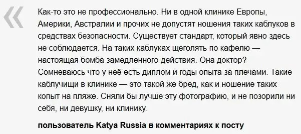 Московская клиника опубликовала на своей странице в Фейсбуке фотографию молодой длинноногой медсестры в коротком халатике, чем спровоцировала шквал комментариев. Люди начали обсуждать, что можно сказать о компетенции такого врача, а также спрашивать адрес, куда подъехать на обследование. Хотя на самом деле девушка оказалась не медиком, а профессиональной моделью.