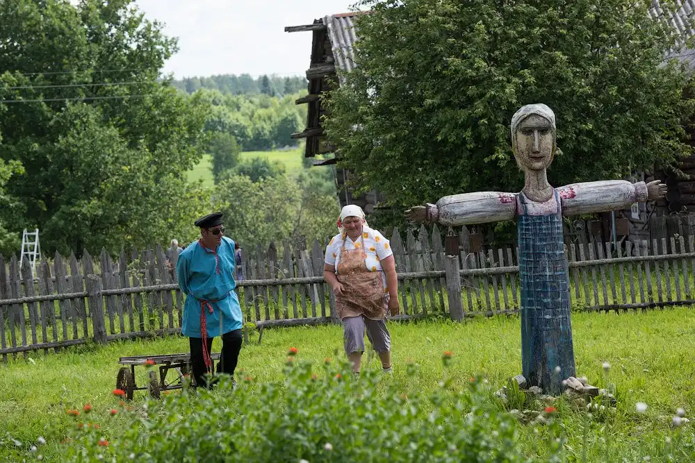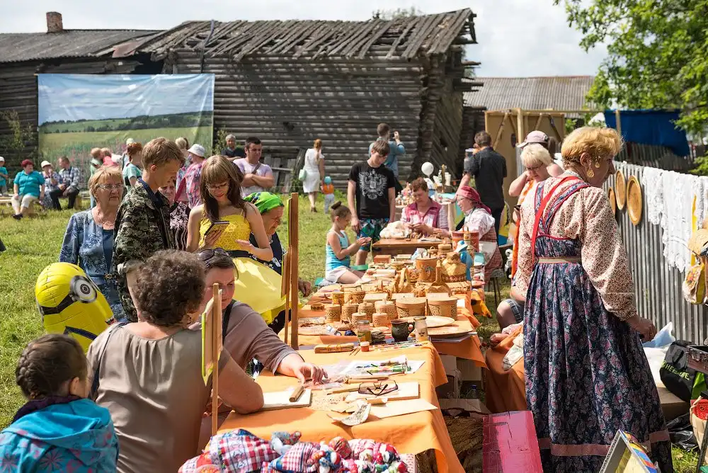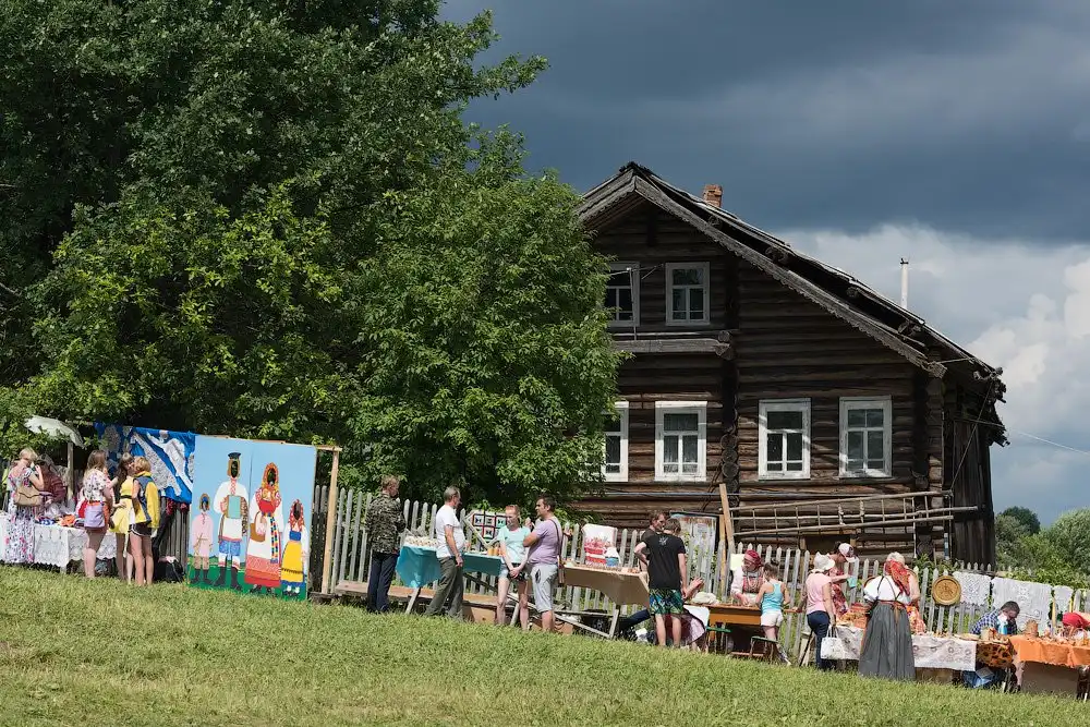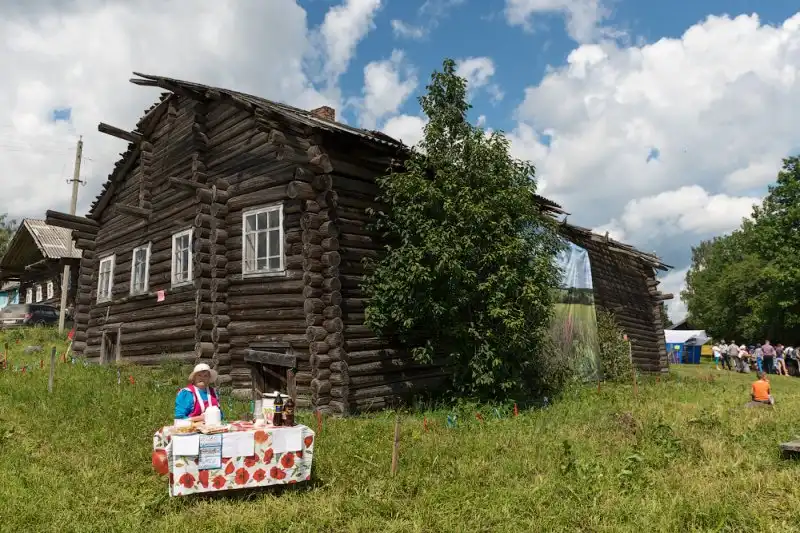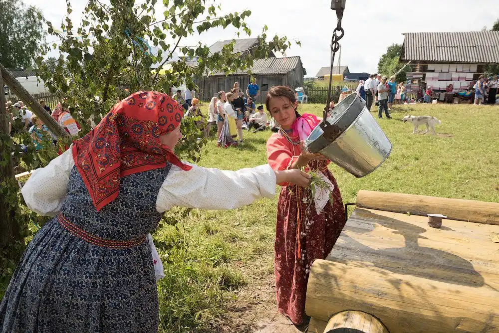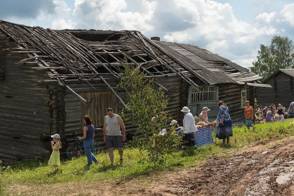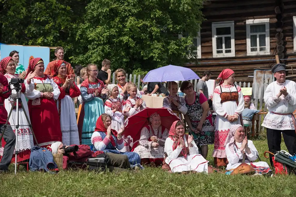 На следующее утро, после путешествия в Сизьму, мы отправились в село Пожарищи - это недалеко от Нюксеницы, что на реке Сухоне. Как оказалось, там уже не первый год в день Троицкого Заговенья проходит большой праздник, с танцами, плясками и угощениями. Фестиваль приобрёл некоторую известность, поэтому на него приезжает довольно много зрителей и участников, и на нём, как нам рассказали, угощают домашним пивом.