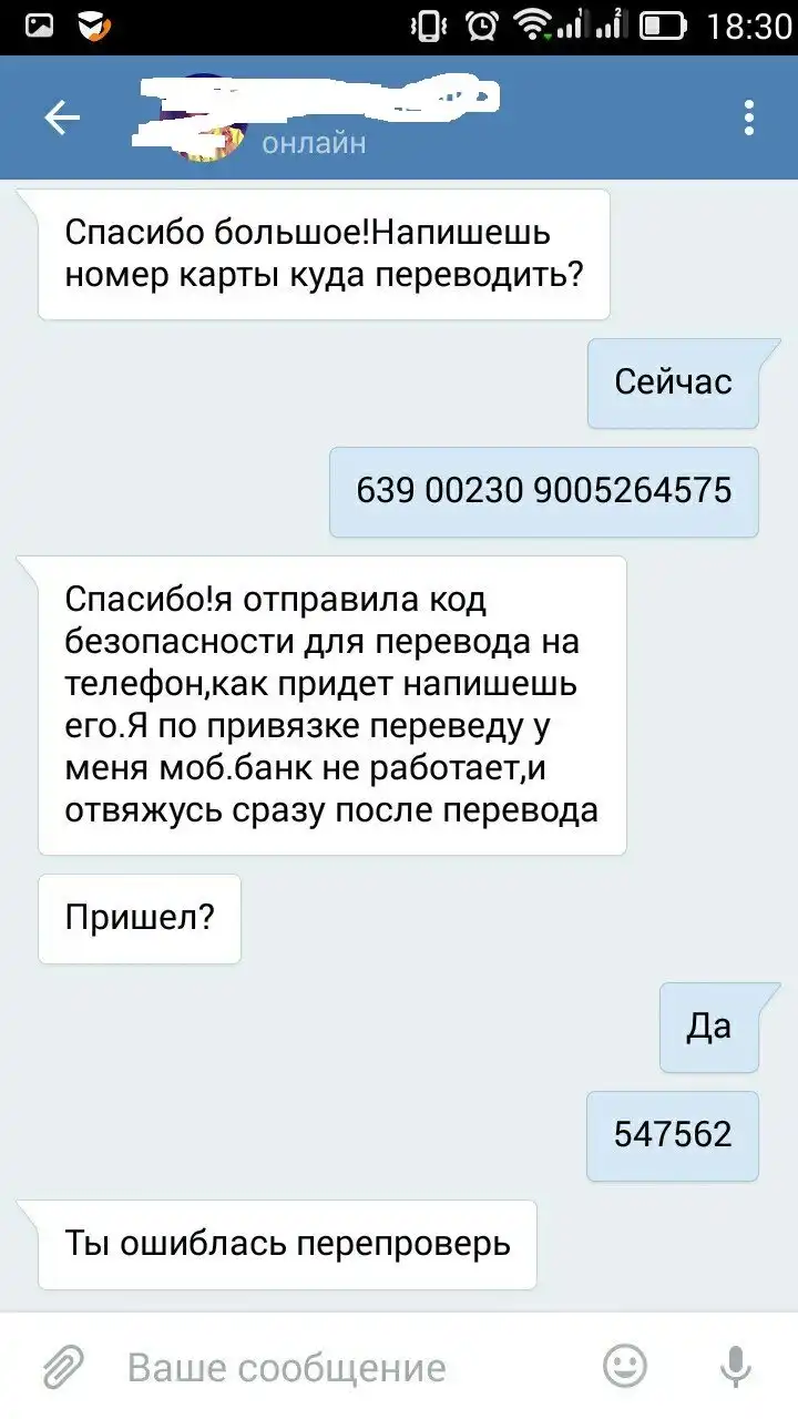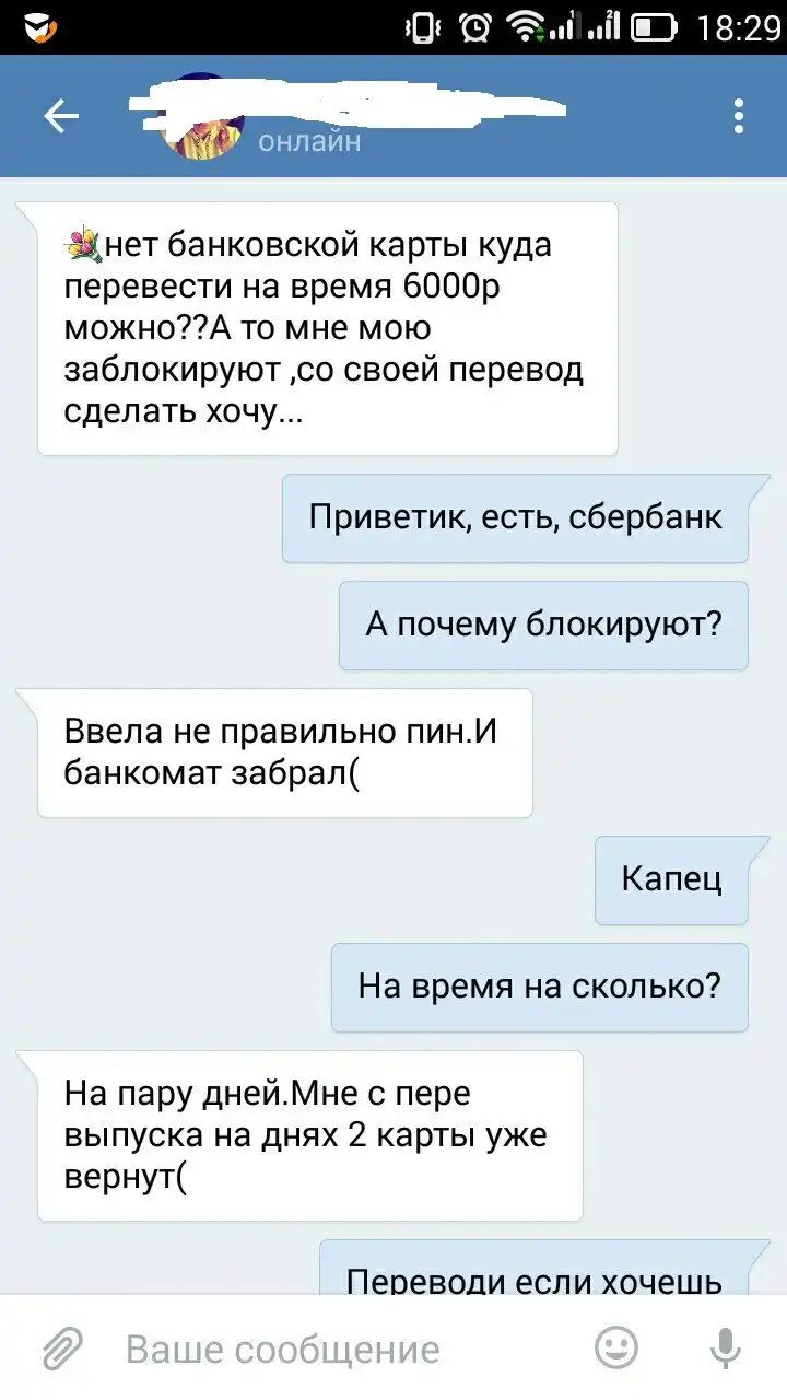 Очень много было постов и скриншотов, как взломщики страниц пытаются занять деньги, ссылаясь на то, что в скором времени их вернут. понятно что в это уже ни кто не верит, и когда от твоего друга или подруги приходит сообщение "переведи мне денежку на карту, я завтра верну" первая мысля которая приходит в голову "Взломали страницу", и человек просто игнорирует сообщение (в большинстве случаев). У меня же не много другая история.