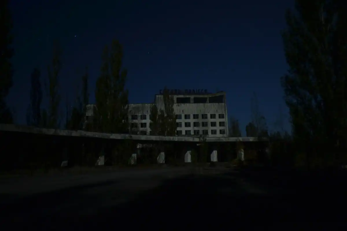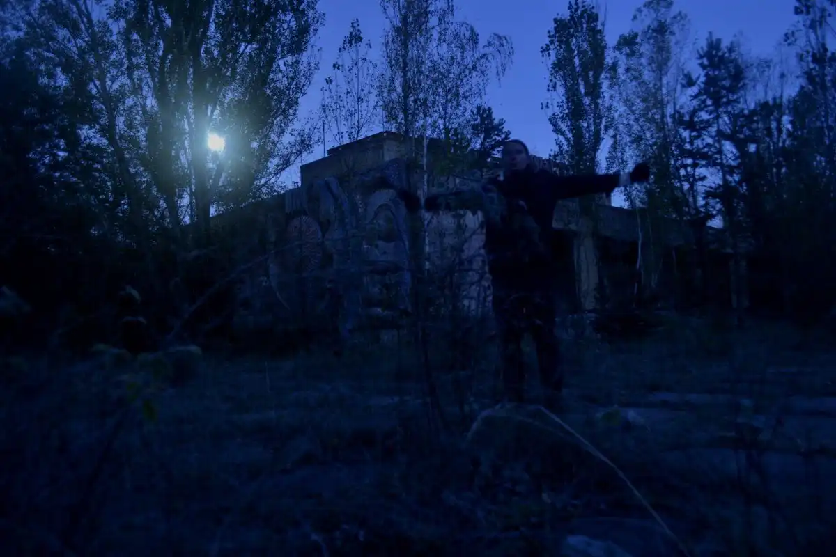Моя идея — немного оживить мёртвый город. Ну и отметить скорое десятилетие S.T.A.L.K.E.R. Было очень темно, поэтому пришлось снимать на длинной выдержке, чтобы под луной было видно здание. Подсветку я делал сам — с нуля. Это диоды, подключенные к аккумулятору. На сборку ушло около часа. Процесс был достаточно нервным из-за страха попасться на глаза патрулю. Я не учёл размеры вывески, поэтому мне не хватило жёлтых диодов, и на ходу их пришлось дополнять белыми. В итоге её цвет не совсем соответствует тому, что был раньше.