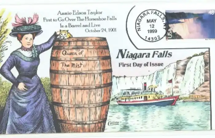 Открытка с изображением события падения Энни Эдсон Тейлор с Ниагарского водопада в бочке.