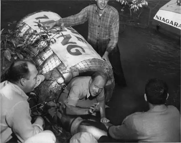 Первый афроамериканец Спустя десятилетие Натан Бойя повторил попытку Реда Хилла. Бойя сначала убедился, что в его резиновом шаре воздуха хватало на 30 часов. 15 июля 1961 г он начал свое рискованное путешествие, и течение унесло шар практически к Американскому водопаду. Бойя был оштрафован на 100 долларов за нелегальный прыжок.