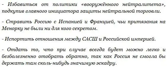 В начале 1780 года лорд Норт, посол Великобритании в России, добился аудиенции у императрицы и предложил следующую сделку: Англия отдаёт Российской империи остров Менорку с отличной гаванью Порт-Магон, а Россия, в свою очередь, отказывается от «вооружённого нейтралитета». Правительство Великобритании, действуя подобным образом, старалось убить нескольких зайцев:
