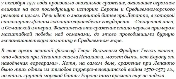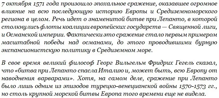 Для Европы конца XVI века битва при Лепанто играла колоссальное значение. Она вошла в историю как пример первой масштабной победы соединенных сил европейских государств над Османской империей в морском сражении. Ее воспевали европейские поэты, запечатлели европейские художники. Пожалуй, самым известным за пределами круга историков участником этой битвы является Мигель де Сервантес Сааведра. Известно, что он очень гордился своим участием в этом эпохальном для Европы сражении. На всю жизнь остался у Мигеля Сервантеса и след от участия в абордажных боях — у него не работала левая рука, в которую писатель был ранен во время схватки. Кстати, на этом злоключения Сервантеса не закончились — возвращаясь домой, он и его брат были захвачены в плен алжирскими пиратами и долгое время провели в Северной Африке в плену. Лишь в 1580 году родственникам удалось выкупить Мигеля Сервантеса.