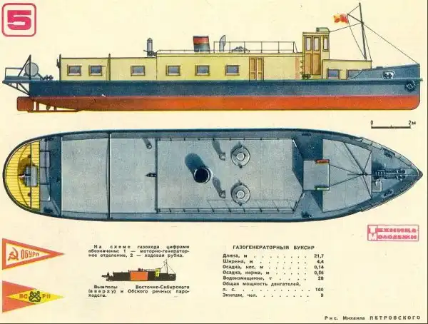 Это было небольшое судно с деревянным корпусом. Двигателем служил 60-сильный тракторный мотор «ЧТЗ», приспособленный вместо традиционного жидкого топлива для работы на генераторном газе. Последний получался при сжигании древесной чурки.