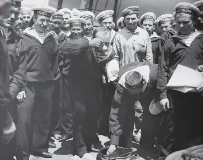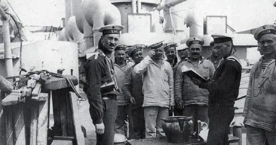 На палубе броненосного крейсера "Рюрик" перед раздачей винной порции