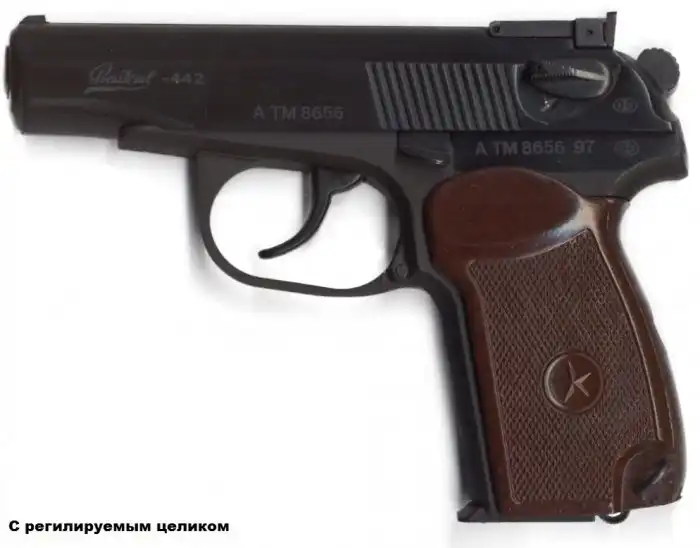 Пистолет может комплектоваться тремя вариантами магазинов: на 8, 12 и 10 патронов; последний имеет ограничитель для соответствия оружейному законодательству многих стран. Стандартная форма рукояти — аналогичная ПММ, однако пистолет с однорядным магазином может комплектоваться и рукоятью от ПМ. Для рынка Канады был выпущен вариант пистолета с удлиненным до 110мм стволом. Сертифицирован Байкал-442 в США был в трёх калибрах: 9x18ПМ, .380ACP (9х17 Kurz) и… 9х19 Para. Как такое может быть?