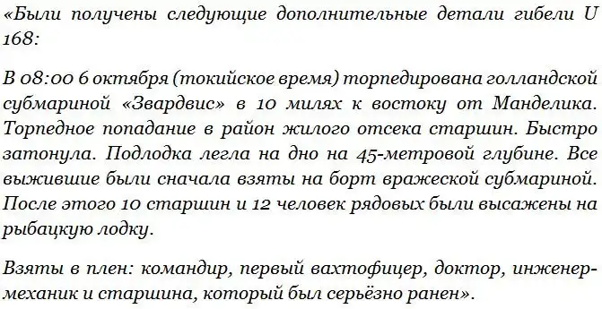 Подробности гибели U 168 с немецкой стороны сохранились благодаря рапорту допроса четырёх немецких подводников, включая и командира лодки Гельмута Пиха, которые были доставлены «Звардвис» в Фримантл. Этот интересный документ раскрывает причины потери Пихом своей лодки (перевод. Е. Скибинского):