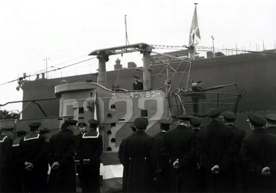 13 октября 1942 года на верфи «Джон Браун энд Компании» (John Brown & Company) в Клайдбанке (Шотландия) была заложена очередная британская субмарина T-класса, которая получила название «Талент» (HMS Talent). Однако ещё до её спуска на воду было принято решение передать её голландским союзникам, и 23 ноября 1943 года лодку у верфи принял голландский экипаж. Новый подводный корабль был назван «Звардвис» (нидерл. Zwaardvisch — «рыба-меч»), а его первым командиром стал лейтенант тер зее 1-го класса Хендрикус Абрахам Валдемар Госсенс (Hendrikus Abraham Waldemar Goossens). Он был опытным подводником и успел совершить на своей предыдущей лодке О 14 несколько походов в Норвежском море — правда, без каких-либо успехов.