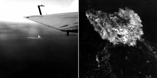 Взрыв глубинной бомбы (слева) — и по поверхности океана