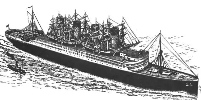 Еще более крупным был пароход Фатерланд, построенный всего за три месяца до начала первой мировой войны. Президент компании Баллин назвал этот лайнер высшим выражением духа нации. На постройку гиганта пошло 34500 т стального проката, 2000 т отливок, 2000 т чугуна, 6500 т дерева. Спецификация заняла пять увесистых томов.