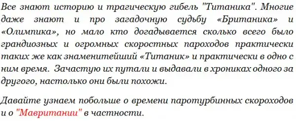 Участь Титаника разделил его собрат — Британник, который сошел со стапеля, когда мир уже был охвачен первой империалистической войной. Как мы узнаем из последующих глав, одно из крупнейших пассажирских судов подорвалось на мине и пошло ко дну.