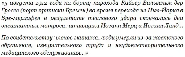 К этому протоколу нужно сделать небольшое пояснение — что такое «внештатный матрос». Как мы уже говорили, бегство с пароходов было массовым явлением, но капитаны в таких случаях особенно не расстраивались: тут же в порту всегда можно было встретить несколько безработных эмигрантов, которые, отчаявшись найти счастье за океаном, стремились вернуться обратно. А поскольку денег на билет у них не было, они готовы были на любых условиях попасть на лайнер — только бы добраться до дому. Этих-то бедняков, нанимавшихся на один рейс и соглашавшихся за похлебку и кусок хлеба по 12 и более часов в сутки перекидывать уголь в котельном отделении (другой работы им, понятно, не предлагали), и называли внештатными матросами. А теперь познакомимся с другим протоколом, составленным на этот раз в Гамбурге 9 мая 1913 года: