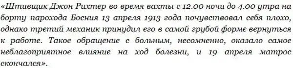 13 апреля 1913 года внештатный матрос Джон Рихтер во время вахты почувствовал себя плохо и доложил об этом вахтенному механику. Тот обрушил на матроса каскад площадной брани и заставил Рихтера вновь взяться за тележку с углем. Но сдвинуть ее с места Джон Рихтер не смог. Он упал и первое, что увидел над головой, открыв глаза, — это перекошенное от злости лицо механика. Собрав остатки сил, Рихтер поднялся и, поскольку ноги не держали его, прислонился к переборке. Тогда механик схватил лопату, которой кочегары кидали в топку уголь, и несколько раз ударил Рихтера по спине.