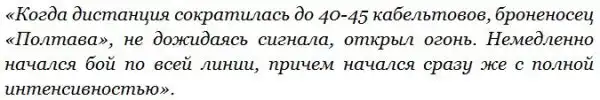 Точное время возобновления боя «Русско-японская война 1904-1905 гг.» не сообщает, но из контекста ясно, что произошло это уже после 16.30. Допустим, это правда. Но почему тогда японцы не начали сражения, атаковав сильно отставший русский броненосец, а открыли огонь только после того, как вышли на траверз «Пересвета», т.е. когда даже концевой «Якумо» давно прошел уже траверз «Полтавы»? Почему В.К. Витгефт, до того проявивший себя неплохим командующим в бою, оставил «Полтаву» на съедение японцам, бросив ее в двух милях по корме «Севастополя»? И что же — получается, что мемуары С.И. Лутонина совершенно не заслуживают доверия, потому что в этом случае все его записи о возобновлении боя ложны от начала и до конца?
