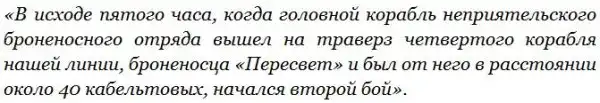 Если даже считать, что «исход пятого часа» это 16.45, то и тогда получается получасовая разница с данными С.И. Лутонина, но самое главное — мичман Пчельников никак не мог выстрелить по «Микасе», когда последний находился на траверзе «Пересвета», потому что к этому времени флагманский броненосец Х. Того был уже давно за пределами досягаемости его башни!
