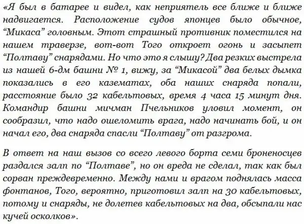 Допустим, что бой все же начался именно в 14.15, в момент, когда «Микаса» был на траверзе «Полтавы». Но «Полтава» отстоял от «Севастополя» на 2 мили, и даже если считать, что между «Севастополем» и «Пересветом» выдерживался штатный интервал 2 кабельтова (а со слов «Заключения» — НЕ выдерживался) то и тогда «Полтаву» отделало от «Пересвета» (с учетом длины «Севастополя» примерно 22,6 кбт. Для того, чтобы выйти на траверз «Пересвета» не то, чтобы «к концу пятого часа», но хотя бы даже к 17.00 «Микасе» нужно было обогнать «Полтаву» на 22,6 кбт, т.е. идти со скоростью на 3 узла быстрее, чем шел В.К. Витгефт, и если русская эскадра действительно шла со скоростью 14 узлов или хотя бы «около 14 узлов», то получается, что броненосцы Х. Того летели вперед на 17 узлах?!! И если до 16.45 русская эскадра не вела боя, то чем же она тогда занималась? Созерцала расстрел «Полтавы»? И как отлично вышколенные японские комендоры за полчаса боя «в одни ворота» не могли подбить броненосец, сражавшийся в одиночку против семерых? И почему ни в одних мемуарах (в том числе и у самого С.И. Лутонина) мы не читаем ничего подобного?
