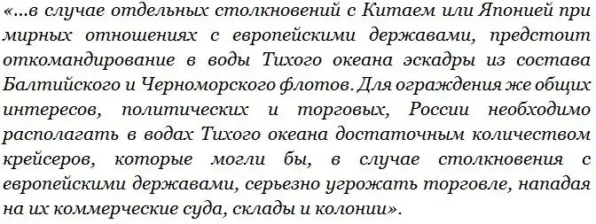 Весьма интересными были задачи Тихоокеанского флота. С одной стороны, признавалось, что для обороны «важнейших пунктов побережья» военный флот вообще не нужен, и этого можно достигнуть