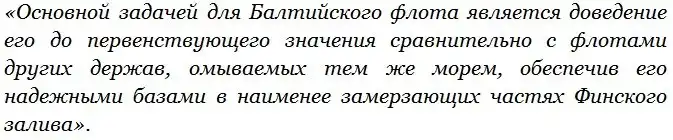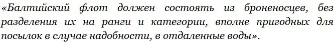 При этом обращает на себя внимание тот факт, что Российская империя не претендовала на господство в океанах, явно понимая, что на том этапе развития подобная задача ей не по силам. Однако Россия не желала вовсе отказаться от океанского флота — он был нужен ей, в первую очередь, как политический инструмент влияния на передовые в техническом отношении страны. В военном же отношении Российская империя нуждалась в защите своего побережья в Балтийском море, а кроме того, она желала господства на Балтике и в Азии: но это разумеется, только при условии невмешательства флотов первоклассных морских держав — Англии или Франции.