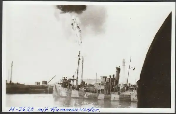 В 1941 году для защиты от низколетящих самолетов несколько немецких сторожевиков были оборудованы экспериментальными зенитными огнеметами. Огнемет укреплялся на мачте и выстреливал столб пламени на высоту 35-50 метров. Запаса горючей смеси хватало на 50 выстрелов продолжительностью по 3 секунды. Как и следовало ожидать, популярности это оружие не приобрело. Кроме практически нулевой эффективности, оказалось, что остатки несгоревшей смеси стекают вниз по мачте и при следующем огнеметании воспламеняются. Кроме того использование огнемета в ветреную погоду угрожало как самому кораблю, так и соседним судам.