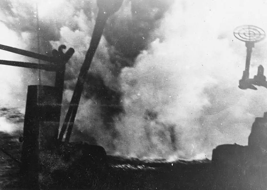 Взрыв тяжёлой авиабомбы у борта крейсера «Perth», май 1941 года