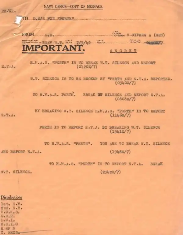 судьба крейсера «Perth». Несколько раз повторено: «Крейсер