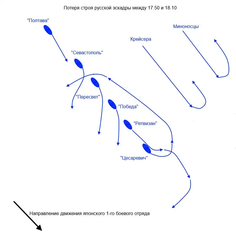 Итак, ближе к 18.50 положение эскадры было следующим: «Ретвизан» шел в Артур со скоростью порядка 11, быть может – 13 узлов. За ним, постепенно отставая, следовал пытавшийся собрать эскадру под свое командование «Пересвет» – несмотря на то, что он шел не более 8-9 узлов и уж на такой-то скорости, казалось бы, следовало ожидать быстрого восстановления кильватерной колонны, фактически он имел в строю только «Победу» и «Полтаву. «Севастополь» явно старался вступить в строй, но, невзирая на малую скорость «Пересвета», отставал, а «Цесаревич», несмотря на свои попытки вступить в кильватер «Севастополю», в сущности, шел вне строя «куда-то в ту сторону». «Ретвизан» же, идущий перед «Пересветом», хотя и был формально в строю, но фактически оставался для П.П. Ухтомского неуправляемым.