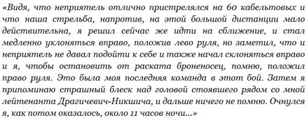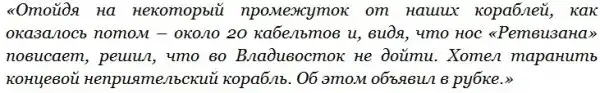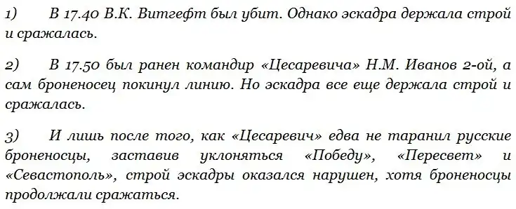 Безусловно, свидетельство Н.М. Иванова 2-го вызывает множество вопросов – в период его командования, т.е. где-то с 17.40 до 17.50 японская линия никак не могла отстоять от «Цесаревича» на 60 кбт, по многим иным свидетельствам, она не превышала 21-23 кбт. В это время «Микаса» уже обогнал «Цесаревич», пройдя его траверз примерно в 17.30, весьма вероятно, что «Цесаревича» обогнал и «Асахи». В этих условиях доворот на противника, о котором говорит командир «Цесаревича», да еще и с последующим отворотом кораблей Х.Того, выглядит крайне сомнительно.