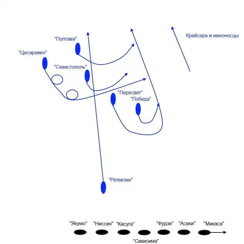 «Победа» - броненосец, заметив выход из строя «Цесаревича», продолжает идти в кильватер за «Ретвизаном», однако теперь на корабле внимательно наблюдают за «Пересветом». Тактика самая верная: конечно, «Победе» следует вступить в кильватер «Пересвету», но сигнала «Следовать за мною» П.П. Ухтомский не дал (а на соседний броненосец это можно сделать хоть семафором). И пока младший флагман не предпринимает никаких действий, «Победа» не ломает существующий строй, но при этом командир «Победы» готов отреагировать на сигнал или изменение курса «Пересвета». Все вроде бы правильно: вот только неспособный управляться «Цесаревич» идет на сближение, траектория его движения непонятна и в любой момент может измениться, отчего «Победа» вынужден, не следуя далее за «Ретвизаном», отвернуть вправо и тем нарушить строй.