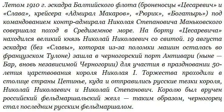 Однако Николай Николаевич повел себя в этой ситуации в высшей степени своеобразно. Оскорбление, нанесенное России, его не задело. Великий князь сказал Маньковскому, что после ухода из Антивари «Цесаревич» идет уже не под его флагом, а под флагом адмирала, следовательно, тому и разбираться в том, что произошло, и решать, как действовать. А сам Николай Николаевич сейчас просто частное лицо, которому пора на поезд. И отбыл на берег.