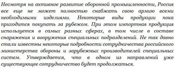 Остается надеяться, что существующие нужды вооруженных сил будут оформлены в виде технического задания для отечественной промышленности, благодаря чему появятся новые собственные проекты требуемой техники. Армии нужна новая техника различных типов, часть которой в нашей стране пока не производится. В существующих реалиях освоение производства образцов совершенно новых для нашей страны типов и классов является важнейшим делом и поэтому должно иметь соответствующий приоритет.