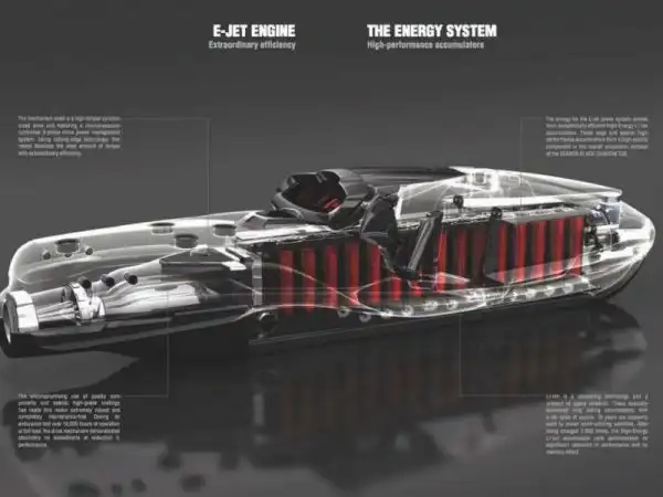 В корме аппарата SBS 730 помещается движитель типа E-Jet. Это устройство представляет собой очередной вариант водометного движителя с электрическим приводом. В его конструкции применяются некоторые оригинальные идеи, что позволило компании-разработчику получить патент на такое изобретение. В собранном виде E-Jet представляет собой устройство, состоящее из двух основных частей. Носовой отсек, выполненный в виде цилиндра с головным и хвостовым обтекателями, является кожухом ходового двигателя. К хвостовому обтекателю присоединяется ротор, помещенный внутри кольцевого канала.