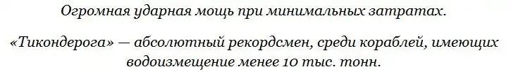 Ракетный крейсер, созданный на платформе эсминца. Изначально причисленный к семейству эсминцев с управляемым ракетным оружием (DDG), однако впоследствии «повышенный в звании» до уровня крейсера (CG). В сравнении с другими крейсерами-ровесниками «Тикондерога» короче атомного «Орлана» на 80 метров, её ширина на миделе меньше в 1,5 раза, а полное водоизмещение уступает в 2,6 раза. В таком масштабе становится отчетливо заметна разница в значениях слова "крейсер" и различия в подходах к проектированию кораблей по обеим сторонам океана.