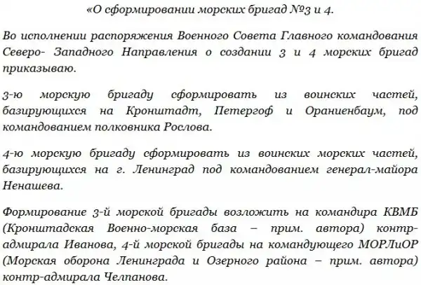 К слову, в составе флота уже была одна стрелковая бригада – 1-я отдельная бригада морской пехоты полковника (а позже — генерал-майора береговой службы) Т.М. Парафилло. Ее батальоны приняли активное участие в обороне Таллинна. Бригада имела и собственную школу для младшего комсостава.