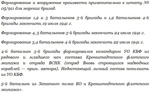 Из отчетных документов соединений и объединений флота известно, что срок формирования батальонов морской пехоты мог иногда занимать не более одних суток. И редко когда он длился больше трех. Речь идет как об отдельных батальонах, так и о тех, которые входили в состав более крупных соединений.