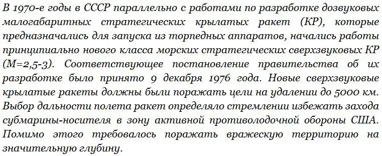 Первоначально в качестве потенциального носителя предполагалось использовать АПКРРК проекта 949, модернизированный по проекту 949М. Но проектные разработки, выполненные ЦКБ МТ «Рубин», продемонстрировали, что для размещения новых крылатых ракет ЗМ-25 на пусковой установке ПКРК «Гранит» требовалось радикальное изменение конструкции. Обеспечение для ракеты достижения сверхзвуковой скорости полета привело к значительному росту ее массогабаритных характеристик в сравнении с крылатыми ракетами «Гранит», а также к необходимости размещения ракет не в торпедных аппаратах, а в специальных пусковых контейнерах.
