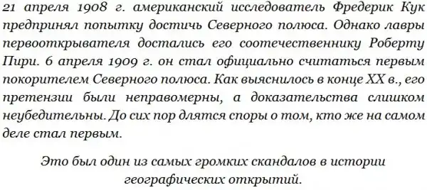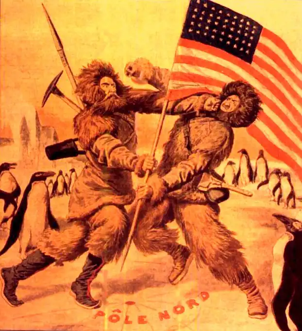 Из-за отсутствия радиосвязи известие о том, что Пири достиг Северного полюса, было отправлено только в сентября 1909 г. («Звезды и полосы вбиты в полюс!»). А пятью днями раньше пришла телеграмма от Фредерика Кука, чья экспедиция растянулась на год: «21 апреля 1908 г. достигли Северного полюса. Обнаружили сушу далеко на севере». Получалось, что Кук достиг желанной цели еще на год раньше Пири. С тех пор развернулась ожесточенная полемика. Пири тут же заявил: «Не принимайте всерьез заявку Кука. Его эскимосы говорят, что он не удалялся далеко от материка, это подтверждают их соплеменники».