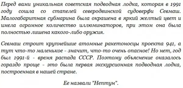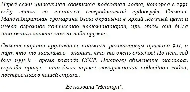 Мировой опыт создания и эксплуатации подводных аппаратов для экскурсий и прогулок начинается с 80-х годов прошлого века. В теплых морях курсирует несколько десятков ПЛ, рожденных в цехах финской и американо-канадской фирм. Сверхмалые субмарины стали настоящими исследователями и экскурсоводами морских глубин. Иллюминаторы, дополнительные средства обеспечения безопасности и небольшая глубина погружения дают возможность ощутить себя заправским подводником. Даже на знаменитом шотландском озере Лох-Несс есть прогулочная подводная лодка, позволяющая совершать увлекательное путешествие под водой.