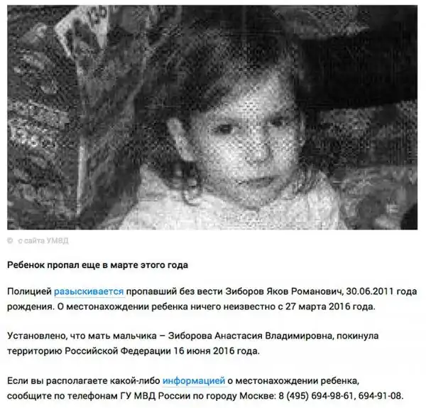 Внимание! Если вы располагаете какой-либо информацией о местонахождении пятилетнего Якова Зиборова, просьба незамедлительно сообщить по телефонам ГУ МВД России по городу Москве