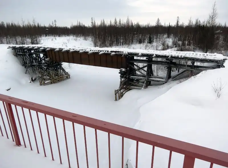 Тем более в нескольких километрах ближе к Надыму находится и самый масштабный сохранившийся объект Трансполярки - Генеральский мост через реку Пензерьяха: