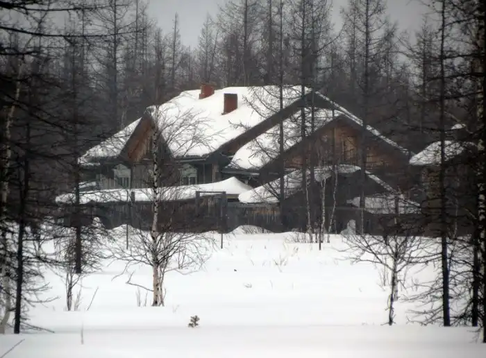Немногим далее в лесочке по левую руку можно заметить шлагбаум, а за ним ухоженные домики, занятые охотничьей базой: