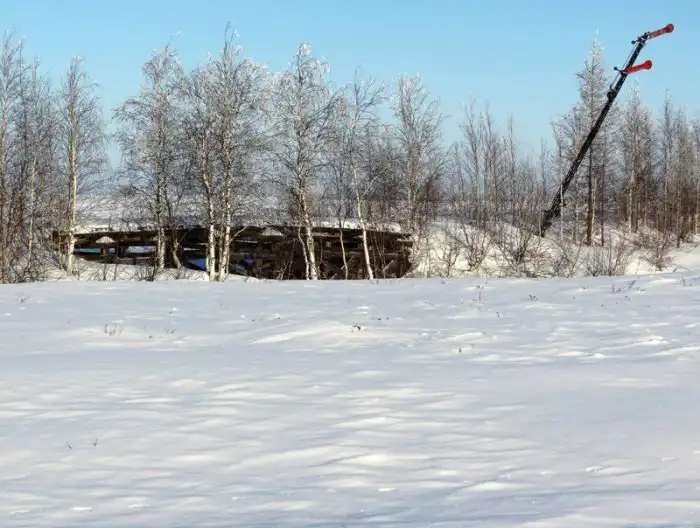 Где-то в часе пути от Надыма - самое известное место зимника: разъезд Щучий, где находятся почти целиком сохранившийся лагерь (в кадре вышка и бараки), семафор и неплохой мост, словом возможность в одной точке составить представление обо всей длине Мёртвой дороги: