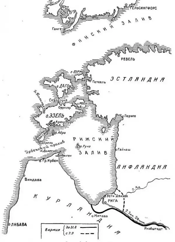 Овладение побережьем Рижского залива – одна из важнейших задач германских сил в период боевых действий в Прибалтике летом 1915 г. Именно тогда была проведена Ирбенская операция германского флота. Но прорыв германского флота в Рижский залив не достиг главной цели - уничтожения русских военно-морских сил в заливе. Главная цель Ирбенской операции – удержание господства в заливе для содействия войскам приморского фланга германской Неманской армии – также не была достигнута. Тем не менее, противник владел побережьем как базой для развертывания последующих боевых операций.
