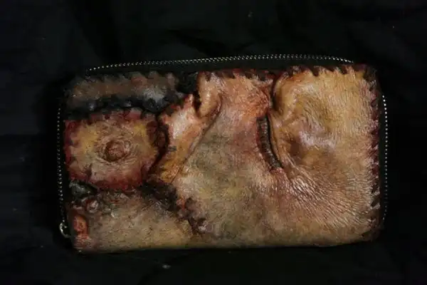 Жесточайшее разочарование, естественно. Эти вещи действительно выглядят, как будто сшиты из кожи с человеческих лиц. Но на самом деле это латекс и силикон. Всё стилизовано под кожу, покрашено, подшито, не отличить от реального даже с одного метра. Стоят такие вещи очень дорого. Так абажур на лампу обойдется в $350+, куртка стоит более $1000.