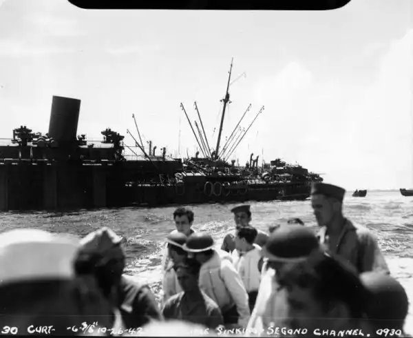 По приходу туда ему было приказано встать на якорь на внешнем рейде. Естественно по закону Мёрфи именно тогда когда Coolidge пришел туда в 9 утра 26го октября у кораблей которые патрулировали вход в гавань была пересменка и эсминец USS Gamble ушел в гавань, а сторожевик USS PC479 из нее только выходил... Параллельно с этим капитан Нельсон пообщался с эсминцем USS Sterett, который сообщил ему что он находится в противолодочном патруле и не может эскортировать корабль в гавань. Капитан Нельсон резонно решил что в районе острова могут быть японские подлодки и что стоять на внешнем рейде слишком опасно, по этому он принял решение что для безопасности надо зайти в гавань по известному фарватеру... На котором было выставлено американское минное поле, но о котором гражданскому капитану не было рассказано так как у него не было секретного доступа! Bидя что транспорт идет на минное поле ему с берега прожектором передали STOP YOU ARE STANDING INTO MINES (Стоп, вы входите нa минное поле), но уже было поздно и не смотря на полный назад тут же раздались два взрыва - одно в районе машинного отделения, а второе возле кормы.