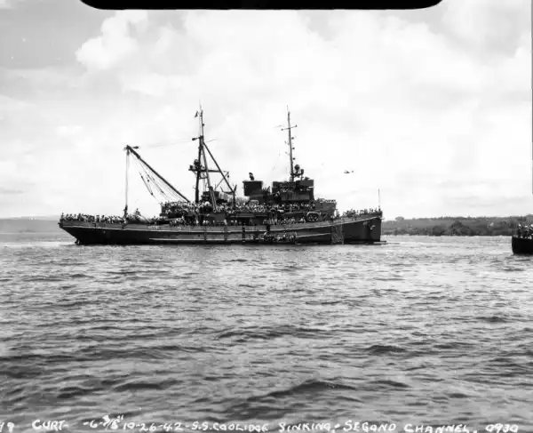 С началом ВМВ Coolidge использовался для эвакуации американских граждан из Гонконга и других частей Азии. В июне 1941го он был переоборудован в войсковой транспорт с полной вместимостью в 5000 солдат и развозил подкрепления по различным островам Тихого океана. При этом он не получил обозначение USS и оставался гражданском кораблем с полностью гражданском экипажем. С началом войны он ходил в Австралию и на разные острова Тихого океана, пока 6го октября 1942го года под командованием гражданского капитана Хенри Нельсона он не вышел из Сан Франциско с приказом доставить 5000 солдат 43ей дивизии на Espiritu Santo.