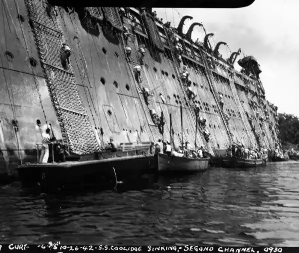 Будучи опытным капитаном, Нельсон быстро понял что корабль уже не спасти и попытался выбросить его на берег. Это у него получилось частично так как корабль уперся в коралловый риф. Это произошло в 9:38. К счастью из-за близости берега удалось спасти практически всех кто был на борту. Из 5340 человек на борту погибли всего двое, машинист в машинном отделении от взрыва мины и артиллерийский капитан который уже спустился с корабля на берег, но вернулся на борт чтобы помочь эвакуации. Так как ожидалось что корабль останется на берегу на ровном киле то солдатам приказали оставить все на борту из расчета потом забрать пожитки и оружие, но так как Coolidge сидел не на берегу на рифе, то вскоре он лег на бок и полностью затонул в 10:52.