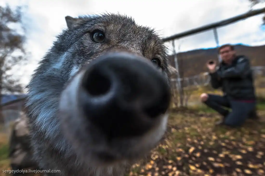 Надо заметить, волки очень любознательны. Участником аттракциона "Поцелуй волка" стал так же и мой Никон: